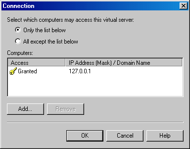 Open up the properties window of the SMTP service by right-clicking on the SMTP service node and selecting Properties. In the properties window, select the Access tab. In the Access tab, open the Connection Control window by clicking on the Connection button in the Connection Control section. Restrict access to the SMTP server by selecting the Only The List Below option and adding the localhost IP address 127.0.0.1 to the access list. Click OK to exit the window.