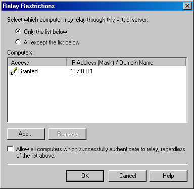 In the Access tab, open the Relay Restrictions window by clicking the Relay button in the Relay Restrictions section. Restrict relay access to the SMTP server by selecting the Only The List Below option and adding the localhost IP address 127.0.0.1 to the access list. Make sure the Successful Authentication Relay option is turned off. Click OK to exit the window.
