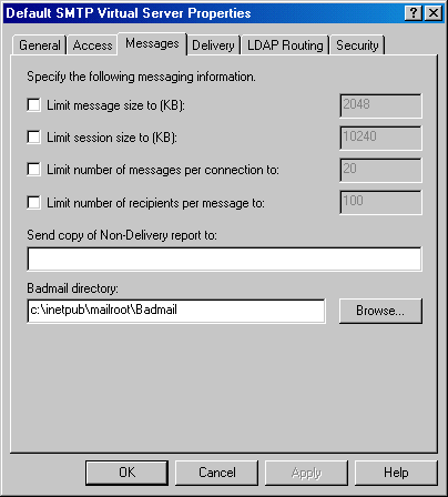 You will probably want to tinker with the "outgoing connection limit" (default is 1000) if one of your goals is to keep MOVEit Central from overloading your "real" mail server. (Typical "throttled" values are from 1-5.) To alter this setting, open the SMTP properties, go to the "General" tab and open the "connection" dialog.
