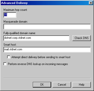 In the Delivery tab, open the Advanced Delivery Options window by clicking the Advanced button. Set the Fully Qualified Domain Name setting to the name of your MOVEit Central server. Set the Smart Host setting to the name of your main SMTP server. Click OK to exit the window. Configuration of the SMTP server is now complete. Click OK in the Properties window and make sure the SMTP service is started.