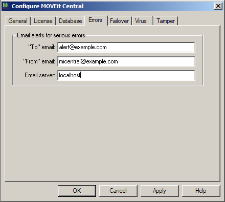 The final step is configuring your Central server to use the new local SMTP service. First, open the MOVEit Central Config program (Start -> Programs -> MOVEit Central) and switch to the Errors tab. Enter localhost as the "Email server" value. Click OK to exit the Config program. The change should happen immediately; no restart is required.