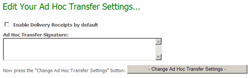 The My Account page exists to allow anyone to change his or her own password or email address without having to contact an administrator. It also provides a place to edit personal display settings, such as how many files or folders are shown on file/folder list pages, and whether or not to use the Upload/Download Wizard for uploading and downloading files. If Ad Hoc Transfer is enabled, you can select to always receive a delivery receipt, and you can enter a signature for packages. The page can be accessed from the user bar which appears at the top of each and every screen.