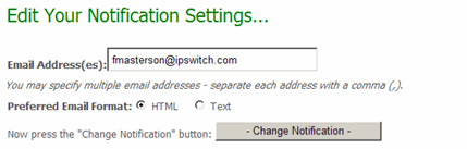 This section lets you change your email address. You may specify multiple email addresses for a single account. In this case, email addresses should be separated with commas. You may also change your preferred format for notification emails that you receive. Available formats are HTML and Text.