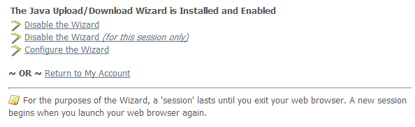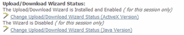 This section contains information about how the Upload/Download Wizard is configured for the current user. There are two versions of the Wizard: ActiveX and Java. The ActiveX version is available only to users of Internet Explorer. The Java version is available only if Java 6 or later is installed on the user's computer.