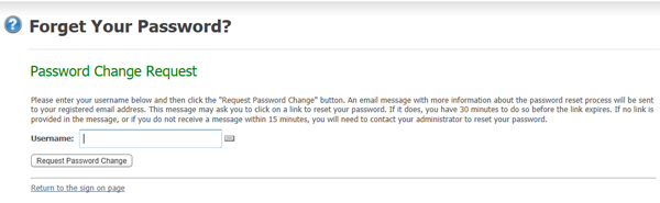 Some organizations may allow you to request an automatic password change if you have forgotten your password, to avoid a round trip though technical support staff. If this option is enabled, a Request a password change link will be present at the bottom of the Sign On page.