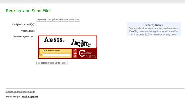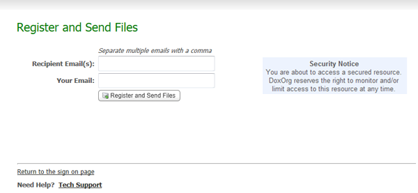 Some organizations may allow you to self-register in order to send a package. Self-registering users are handled according to the organization's configuration as either one-time guest users or limited-time temporary users. If this option is enabled, a Register and Send Files link will be present at the bottom of the Sign On page.