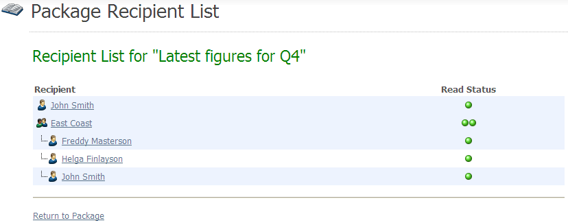 Senders of packages will see an additional piece of information in the header section of the package, called Read Status. This is a quick indicator of how many of the package recipients have viewed the package. The possible status indicators are All, Some, or None.