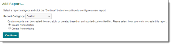 Electing to create a new report from scratch will lead to the Add Report page, as with other report types. Electing to create from an existing report file will cause a file browse box to be displayed. Use this to select the report file to import. A successful import will lead to the Edit Report page, where additional options may be configured.