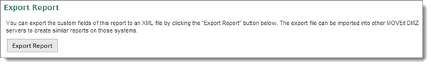 In addition to the Run Report section, the Export Report section appears on the Edit Report page for custom reports. This allows the current report definition to be exported to a file, which can then be imported via the process above. Click Export Report to generate an export file and send it to a browser, where it can be downloaded.