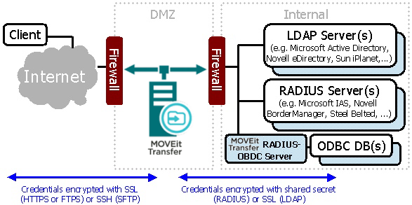 MOVEit Transfer provides the ability to authenticate users to external LDAP and/or RADIUS servers. Microsoft Active Directory (AD) operates as an LDAP server, so MOVEit Transfer can authenticate to it natively. MOVEit Transfer can also authenticate users against ODBC-compliant databases through the use of the optional RADIUS-ODBC authentication service. Both of these transports can be secured at the transport level (we encourage the use of LDAP over SSL) and related credentials are stored encrypted on MOVEit Transfer.