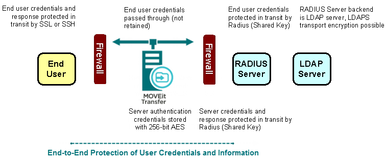 The RADIUS protocol is UDP-based and all packets are encrypted with a key. This key is stored on MOVEit Transfer using 256-bit AES. MOVEit Transfer does not need to know anything about the LDAP server(s) that really hold the user information because the RADIUS server acts as a complete front end. RADIUS queries, by design, return less information about their users than a similar LDAP query.
