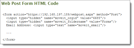 ACTION = "webpost.aspx": An "action" attribute in the "form" tag that points to a copy of "webpost.aspx" on the secure port of the MOVEit Transfer server. For example: <form method='POST' action='https://moveit.myhost.com/webpost.aspx'>