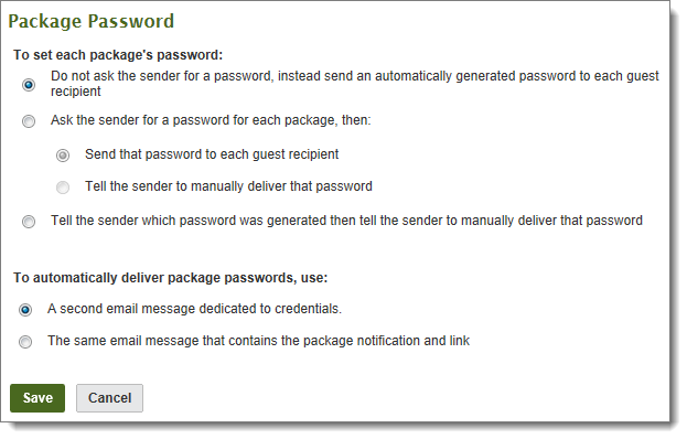 Note: This section appears only if you select Package Password for If Permitted, how should access be granted to recipients of senders who are not currently registered users? (the first prompt on this page).