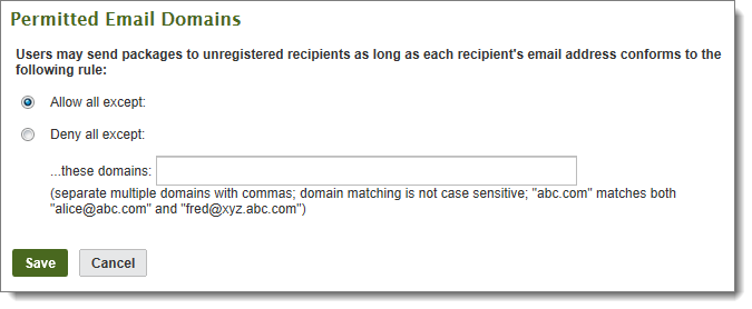 Note: Settings on this page are not used if the SETTINGS > Ad Hoc Transfer > Access > Registered Senders page has the field Which users may send packages to recipients who are not currently registered users? set to None, because no one can send to unregistered recipients.