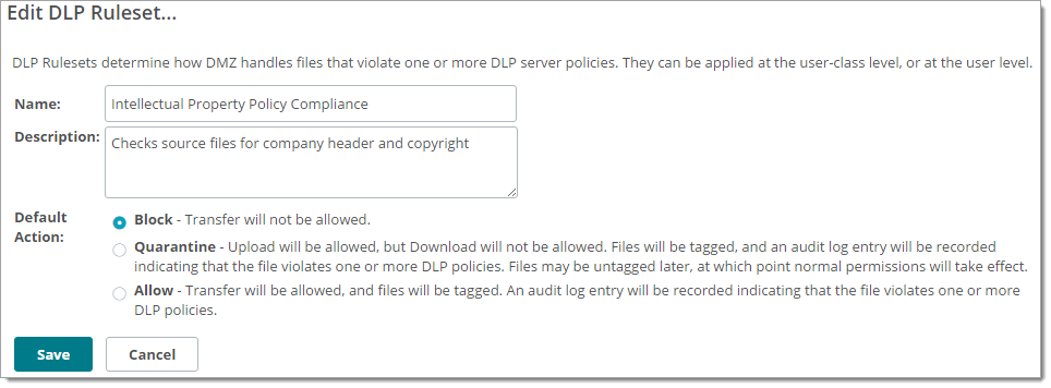 Default Action: Action to invoke when one or more violations are found in the data by the DLP scanner, but none of the rules in the ruleset match the violations reported to MOVEit:
