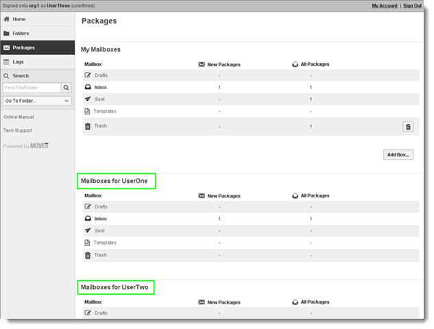 You can perform most of the typical package actions within a shared mailbox, such as viewing and replying to Inbox packages, creating, editing, and deleting Drafts and Templates, viewing Sent packages, sent package read status, package history, and viewing packages in the Trash.