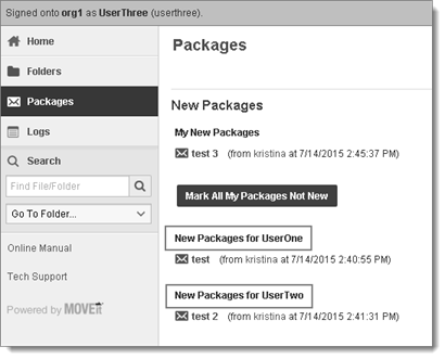 New Package Notifications: When a package arrives in a shared mailbox, all users with access to the shared mailbox receive an email notification of that package arrival (if an administrator has configured notifications). You see My New Packages at the top of the page as usual, followed by New Packages for each mailbox shared with you.
