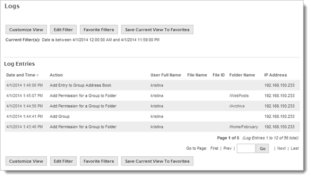 The columns and content customizable through the "Customize View" (columns) and "Edit Filter" (content) links. Pre-defined filters, both built-in and custom, can be accessed by clicking the "Favorite Filters" link, and custom views can be saved by clicking the "Save Current View to Favorites" link. Finally, navigation links ("Go to Page") allow users to page through log entries.