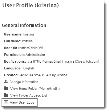 Each user profile has a "View User Logs" link which administrators can use to define a log filter that returns log information about just that user.