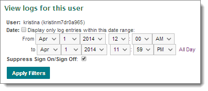 Clicking the link leads to a filter specification page, which allows the admin to select a user to view log information about. Clicking on the Apply Filters button will execute the user filter and show the log entries associated with the selected user.