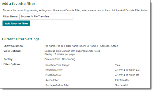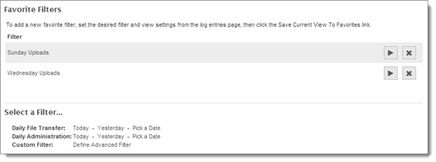 The "Favorite Filters" link will bring up a page which allows users to select a saved custom view, or one of several commonly requested filters involving file transfers, administration, or all activities. The "Define Advanced Filter" link will pop up the Edit Filter form described above.