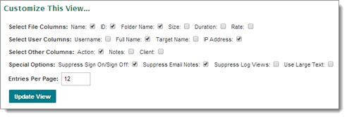 The "Customize View" link will bring up a form which allows users to select the columns displayed in the advanced file view. Changes to these selections will be saved and pre-filled during future log page visits, even between sessions. At least one column must be selected here, or an error will be displayed.