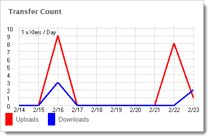 The Transfer Count display shows a summary of the number of uploads and downloads performed during the last 10 days. Uploads are shown in red, while downloads are shown in blue. The display will automatically scale to show all values. The scale of the display can be found in the upper left hand corner.