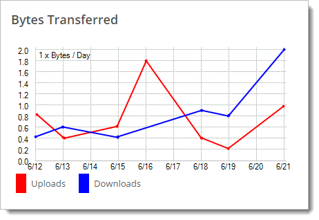 The Bytes Transferred display shows a summary of the total number of bytes uploaded and downloaded during the last 10 days. As with the Transfer Count display, uploads are shown in red, while downloads are shown in blue. The display will automatically scale to show all values. The scale of the display can be found in the upper left hand corner.