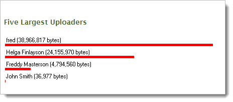 The Five Largest Uploaders display shows a bar graph of the 5 users in the organization who have uploaded the most bytes, according to the current set of audit logs. The relative upload byte counts of the top 5 users are shown as red bars. The actual upload byte counts, along with each user's real name, are also shown.