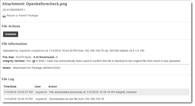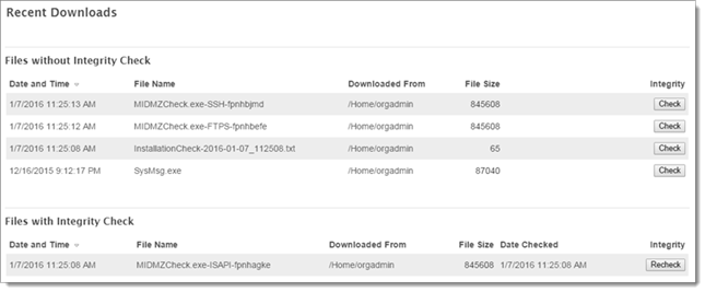 The Recent Downloads page contains details about all recent Folder and Package downloads by the current user, Files are listed in two sections: