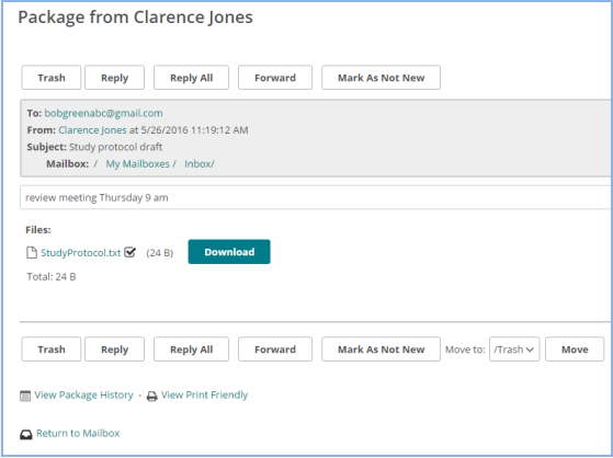 You might receive an email notification when you (or a mailbox that is shared with you) receive a new package. Click (or copy into your browser) the link provided in the email. Sign on to MOVEit with your username and password (registered users) or with the credentials provided by email (unregistered users) to view the package and download any attached files. If enabled, you can also reply to a package and send additional attachments, which will also be uploaded to the file transfer server. The organization administrator sets options that determine who can send and receive packages, enforces user- and package-level quotas, and controls package expiration and download limits.