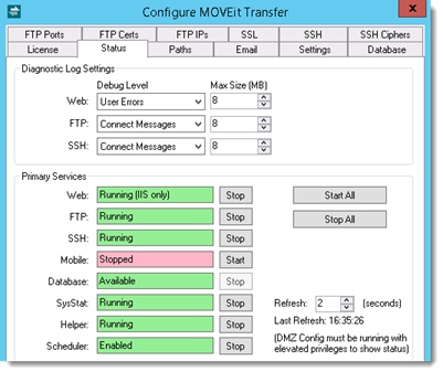 Diagnostic logging levels and log file sizes for the major MOVEit Transfer components are set here. For each component, you can adjust the Debug Level and Max Size.
