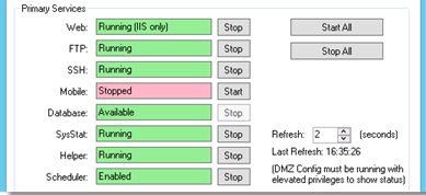 Note: Clicking Start All and Stop All in the Primary Services section also starts and stops the High Availability and Network Load Balancing services.