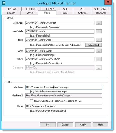 Machine: Used to access authentication and other services from MOVEit Transfer. This URL should refer to the local machines (localhost). The Machine URLs are generated during installation of MOVEit and rarely need to be changed, except in cases where IIS access rules have been changed.