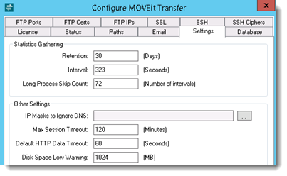 MOVEit Transfer periodically polls the local server for status and performance statistics, and records them into a database for later processing. Statistics Gathering settings determine how that statistics gathering mechanism operates. For more information, see SysStat Service.