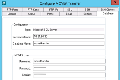 Password (and Confirm): Password of the above database user. This password was configured during the MOVEit Transfer setup and should normally not be changed.