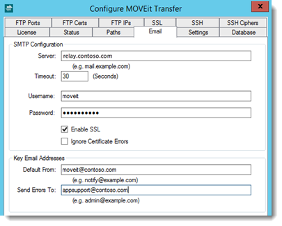 Enable SSL. Enable SSL/TLS between the MOVEit Transfer server and the SMTP server to prevent message eavesdropping and tampering (file payload is already encrypted).