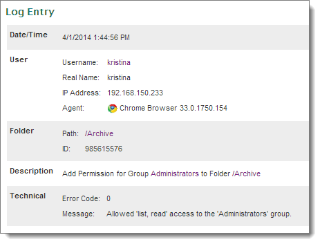 Users, files, and folders that are referenced by log entries can usually be clicked on to view the information page for that item. The date/time value of each log entry can be clicked on to view the details for that particular entry. A certificate icon next to the date/time value indicates that this log entry contains client certificate information, meaning the user who did the action was signed on with a client certificate at the time. The details of the client certificate will be displayed on the log entry page.