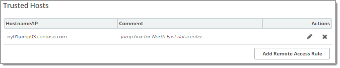 In addition to the access rules for hosts, you can specify a list of trusted hosts for an organization. A host in the Trusted Hosts list will bypass the normal IP lockout and session IP consistency checks. In effect, when a user signs on to the organization from a trusted host, it works like signing on from the localhost. For more information, see the Trusted Hosts section of this document.