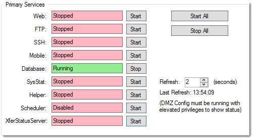 Click the Status tab and close services to prevent users from modifying the MOVEit Transfer filestore.