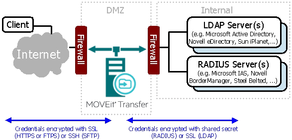 MOVEit Transfer permet d'authentifier des utilisateurs sur des serveurs externes LDAP et/ou RADIUS. Microsoft Active Directory (AD) fonctionne comme un serveur LDAP, de sorte que MOVEit Transfer peut y effectuer des authentifications natives. Les deux peuvent être sécurisés au niveau du transport (Il est recommandé d'utiliser le protocole LDAP sur SSL/TLS.). Les authentifiants associés sont stockés sous forme cryptée sur MOVEit Transfer.