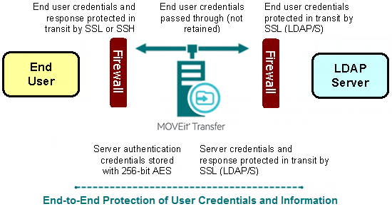 Ce scénario est très courant. Un utilisateur final présente d'abord des authentifiants à MOVEit Transfer via une liaison SSH (FTP/SSH) ou SSL (FTP/SSL ou HTTP/S) cryptée. MOVEit Transfer transfère ensuite ces authentifiants au serveur LDAP via une liaison SSL (LDAP/SSL) cryptée afin de déterminer si cet utilisateur peut se connecter à MOVEit Transfer. MOVEit Transfer ne conserve pas les authentifiants dans son magasin.