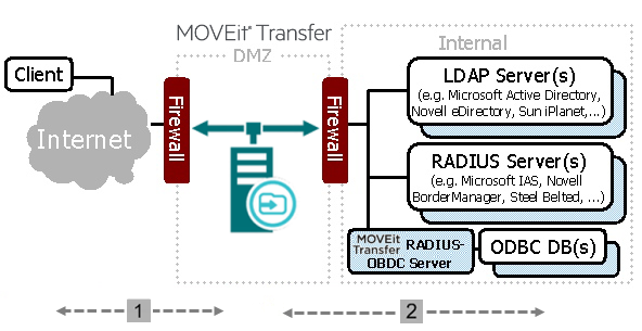 Pour éviter que l’utilisateur doive se rappeler d’une multitude de comptes de connexion, et pour faciliter la maintenance des bases de données de comptes, utilisez la fonction d’authentification externe de MOVEit Transfer pour associer MOVEit Transfer à votre mécanisme d'authentification d’utilisateurs existant. MOVEit Transfer prend en charge l'authentification en faisant des comparaisons avec les serveurs RADIUS et LDAP, ainsi qu'au moyen de sa propre base de données utilisateurs interne. Si vous utilisez un fournisseur d'identité SAML pour l'authentification, il est possible de configurer MOVEit Transfer pour utiliser le fournisseur d'identité. Reportez-vous à la rubrique sur l’authentification externe (« External Authentication ») à la page User Policy Settings (Paramètres de la stratégie utilisateur) pour plus d'informations.