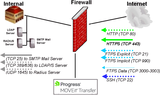 Les protocoles HTTPS, FTP sur SSL (FTP/SSL, ftps) et/ou FTP sur SSH (FTP/SSH, sftp) sont utilisés pour communiquer avec MOVEit Transfer. En règle générale, MOVEit Transfer doit aussi pouvoir accéder aux services SMTP d'un autre serveur de messagerie pour communiquer les messages de notification.