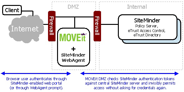 Quand la fonction d’authentification externe est activée, MOVEit Transfer peut communiquer avec le produit CA eTrust SiteMinder pour activer une connexion unique à un serveur MOVEit Transfer opérant dans un environnement SiteMinder. Cela permet aux utilisateurs de se connecter à MOVEit Transfer sans avoir à saisir leurs informations d’identification, dès lors qu’ils sont déjà authentifiés dans l’environnement SiteMinder.