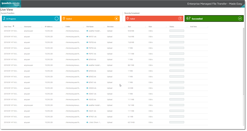 Une version à fenêtre unique d'Affichage en direct affiche les opérations de transfert de vos fichiers gérées pour votre organisation.