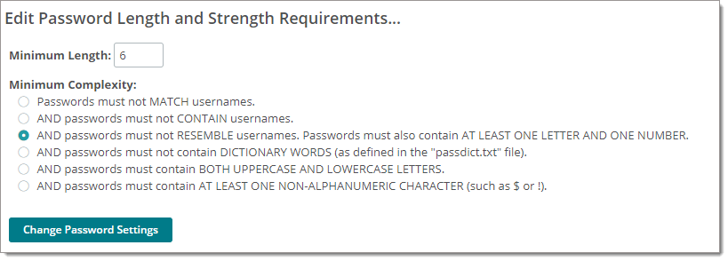 Cette section contrôle la complexité minimale du mot de passe et les exigences de longueur pour le système MOVEit Transfer.