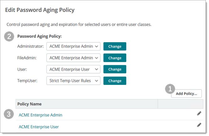 Stratégie de vieillissement des mots de passe (Sélectionnez-en un dans la liste déroulante.) 1. Sélectionnez une stratégie prédéfinie pour chaque rôle d'utilisateur dans votre organisation. 2. Cliquez sur Modifier pour appliquer la stratégie que vous avez sélectionnée. |