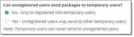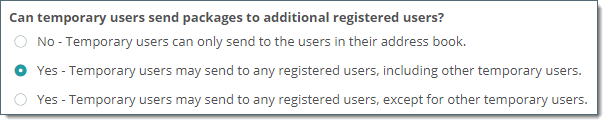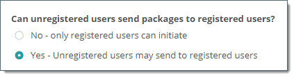 Important : Transfert ad hoc doit être activé avant que les utilisateurs ne puissent utiliser ces paramètres. Accédez à la page SETTINGS > Ad Hoc Transfer > Access > Registered Senders (PARAMÈTRES > Ad Hoc Transfer > Accès > Expéditeurs inscrits) et pour le paramètre Can unregistered users send packages to registered users? (Les utilisateurs non inscrits peuvent-ils envoyer des paquets aux utilisateurs inscrits ?), sélectionnez Yes (Oui).