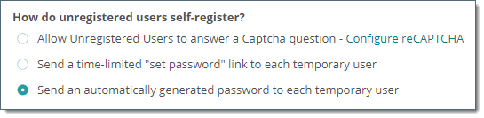 Remarque : Les invites et options suivantes sont affichées si Temporary User (Utilisateur temporaire) est sélectionné dans la page Ad Hoc Transfer - Access - Unregistered Recipients (Ad Hoc Transfer - Accès - Destinataires non inscrits) lors de la première invite.